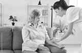 Young friendly nurse or caregiver help sick senior elderly woman patient in receiving IV drip infusion and vitamin injection therapy sitting on sofa in medical clinic. Health care concept.