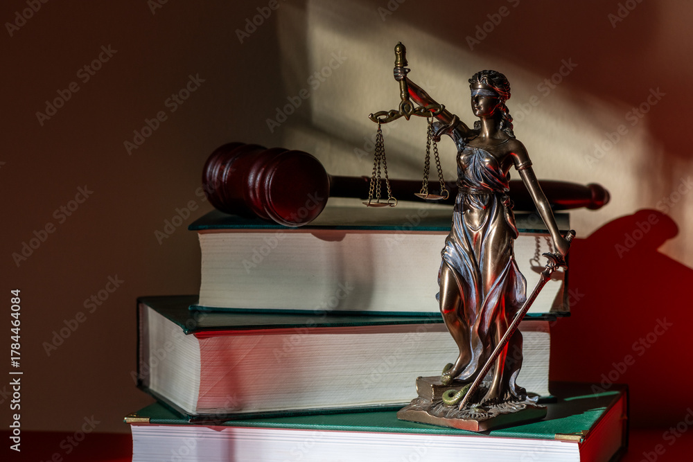 Judge's gavel and the statue of Themis in a light drawing with shadow
