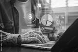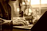 Businessman using digital payroll management on laptop with AI tool, visual data analytics, budget charts, data analytics and calendar planning for efficient salary calculation and financial reporting