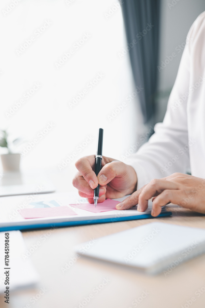 Concept of business planning and financial analysis. A businesswoman writes notes on documents with charts and reports, using laptop and calculator for budget management at modern office desk.