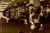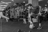 Focused athletic man lifting yellow kettlebell in modern gym interior with equipment and ambient lighting