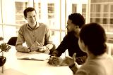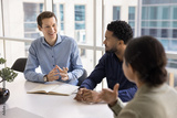 Smiling gen z male office worker speak to diverse colleagues