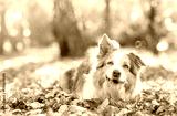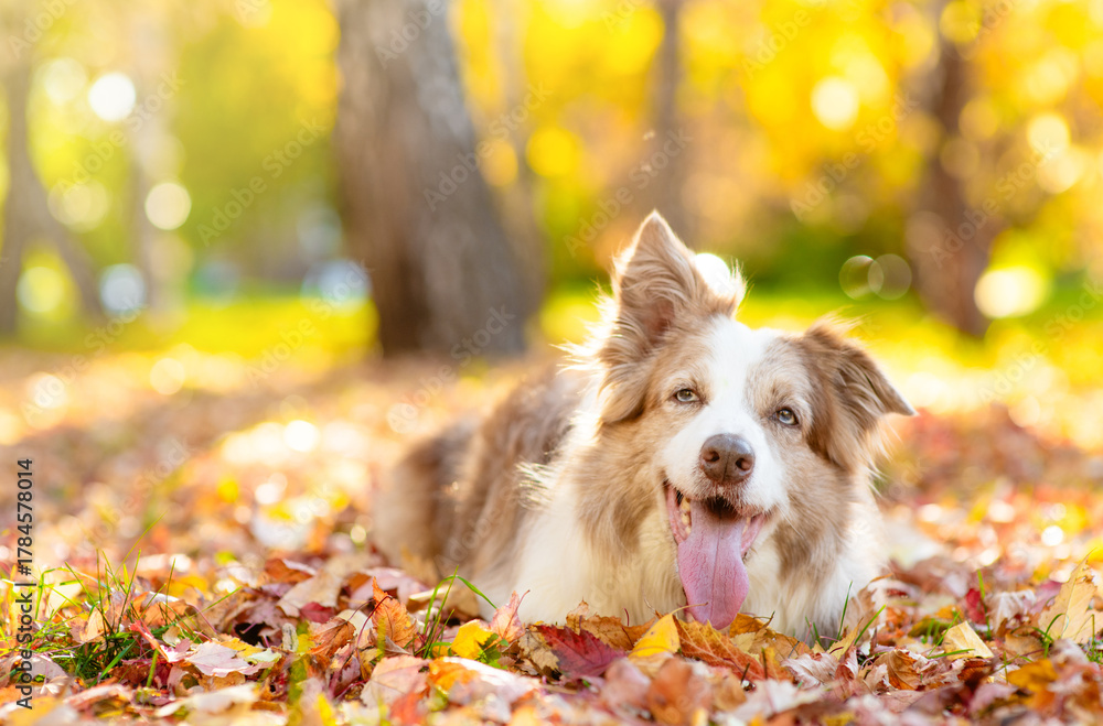 Happy Australian shepherd dog lying on fallen autumn leaves at sunny park. Empty space for text