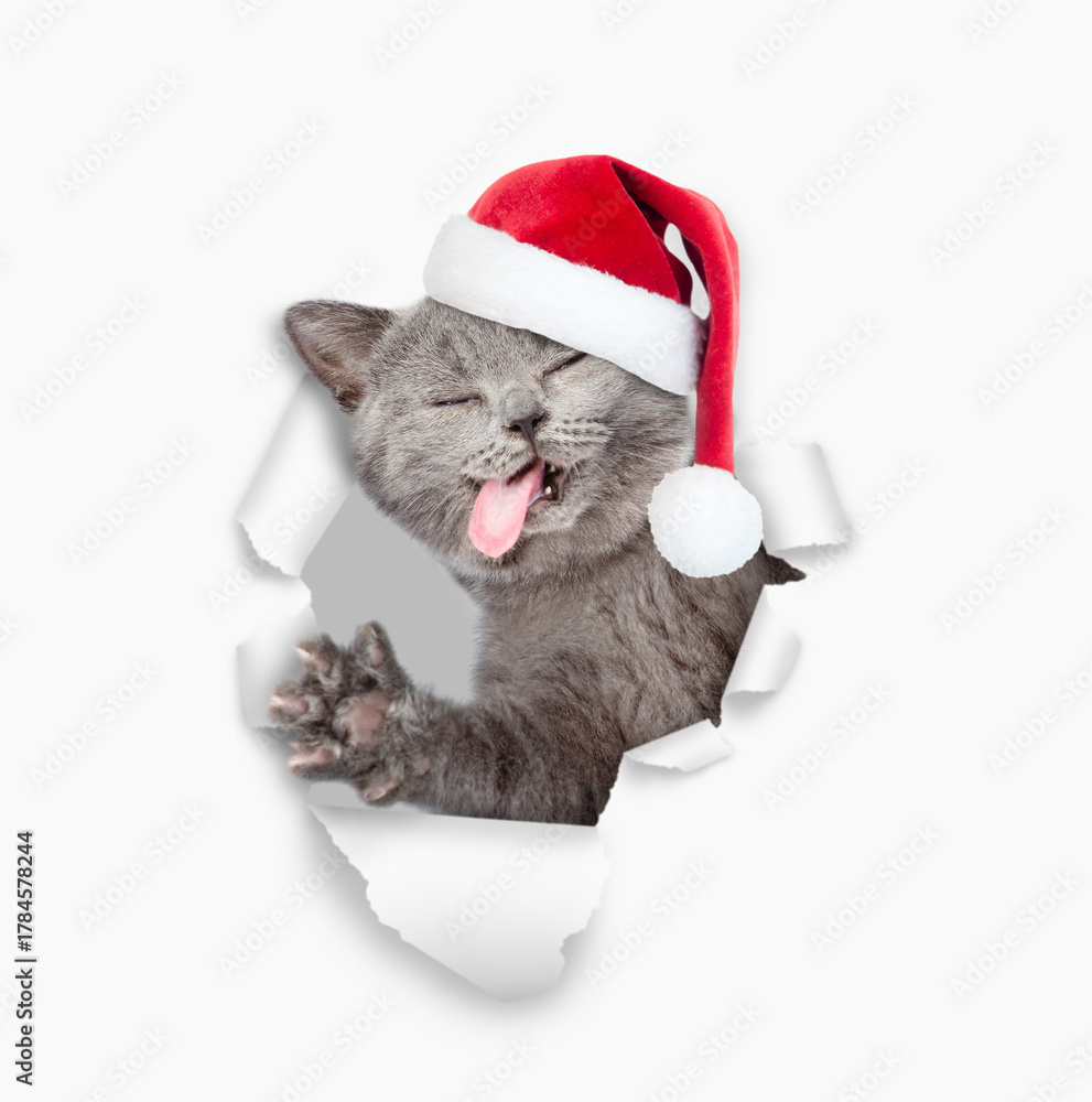 Happy kitten with tongue out wearing red santa hat looking through the hole in white paper