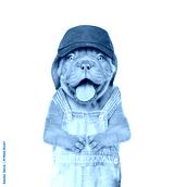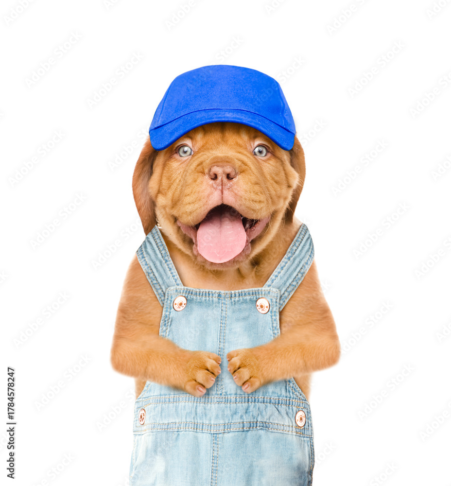 Happy Mastiff puppy worker wearing blue cap and denim overalls looking at camera. Isolated on white background