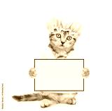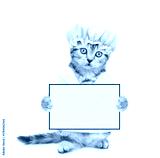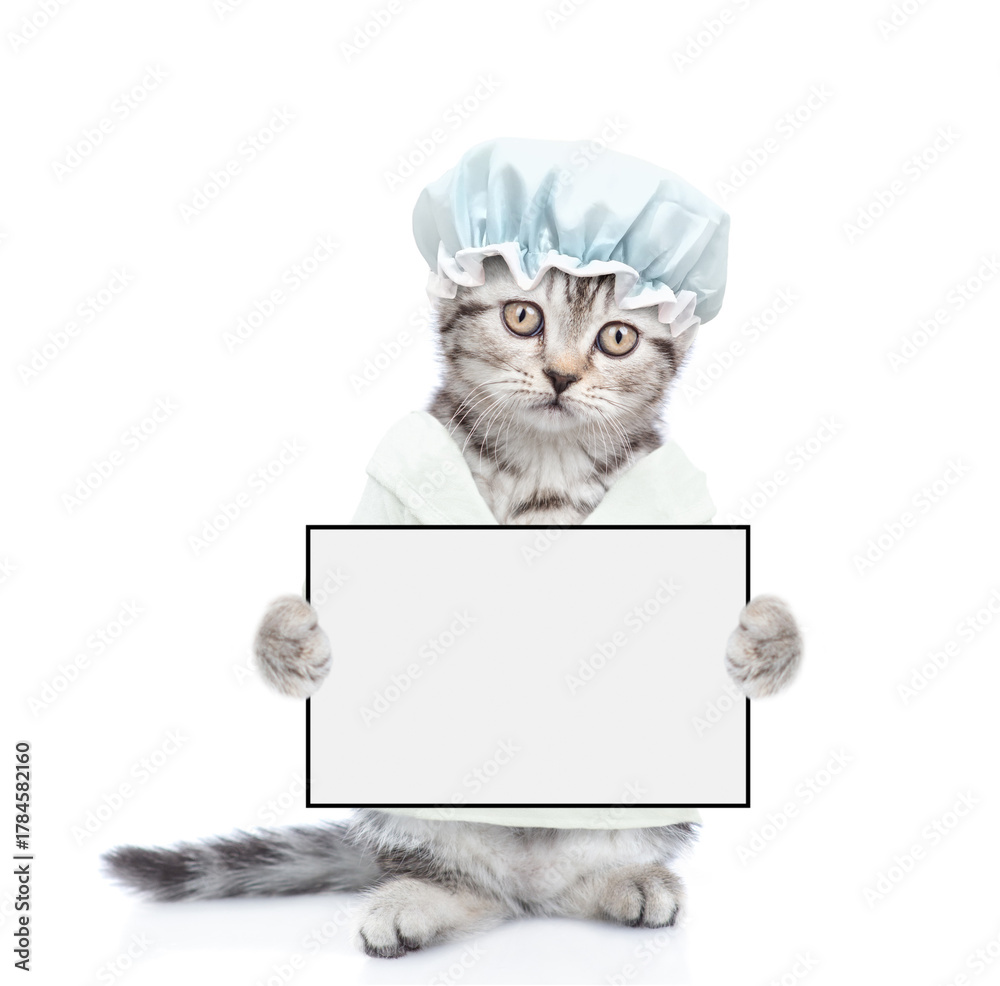 Cute kitten with shower cap on it head wearing bathrobe standing on hind legs and holding blank white board. Empty space for text. Isolated on white background