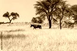 Two horses walking through dry yellow grass in an African savannah with scattered trees in a hot, arid landscape.