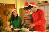 Three siblings enjoy quality time cooking together during Christmas, wearing Santa hats and festive outfits in a cozy holiday kitchen