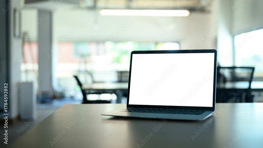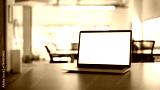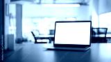Laptop computer on meeting table with empty screen.