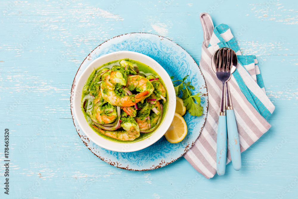 MEXICAN CUISINE. Aguachile de camaron. Prawns aguachile. Shrimps eviche cebiche with cucumber, lemon and purple onion. Top view, blue background