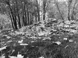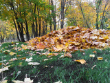 Low view of autumn leaves scattered in a city park. Stillness, passage, and reflection of nature rhythm.
