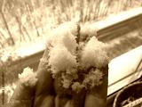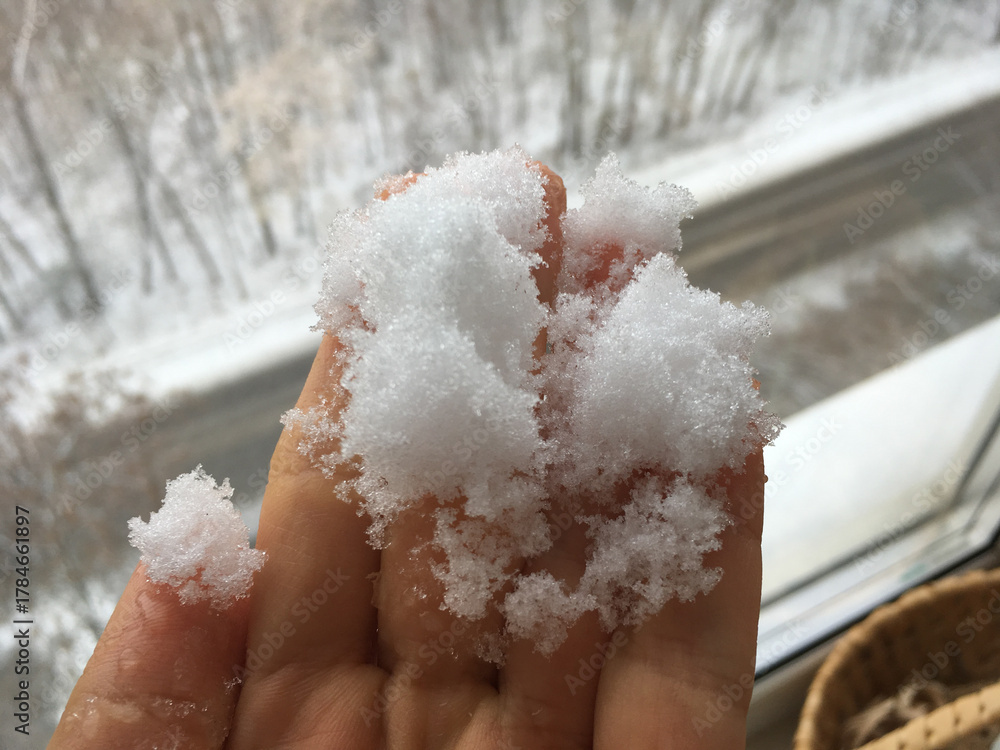 Fresh snow in hand on a winter morning. Touch, perception, and connection between human and season.