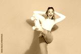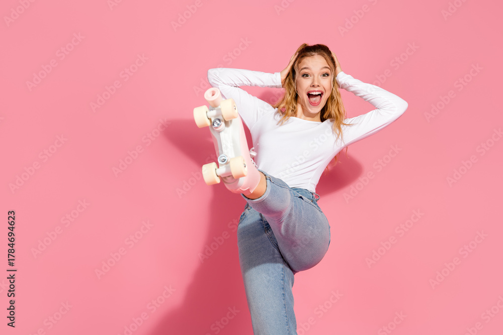 Excited young woman wearing white shirt and jeans posing with roller skate against pink background, showing happiness and fun