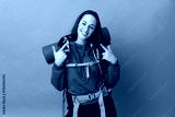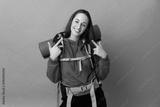 Mountaineer woman with a big backpack over isolated background giving a thumbs up gesture