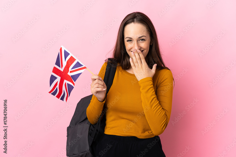 Young hispanic woman holding an United Kingdom flag happy and smiling covering mouth with hand