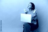 Young mixed race woman sitting on a chair with laptop isolated on purple background in zen pose