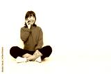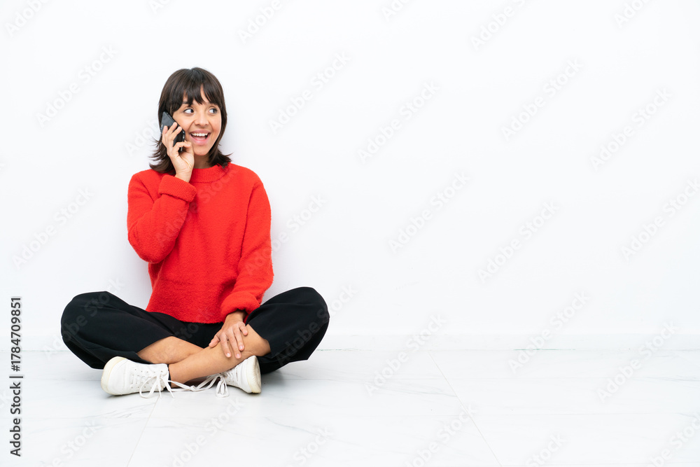 Young mixed race woman sitting on the floor isolated on white background keeping a conversation with the mobile phone