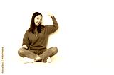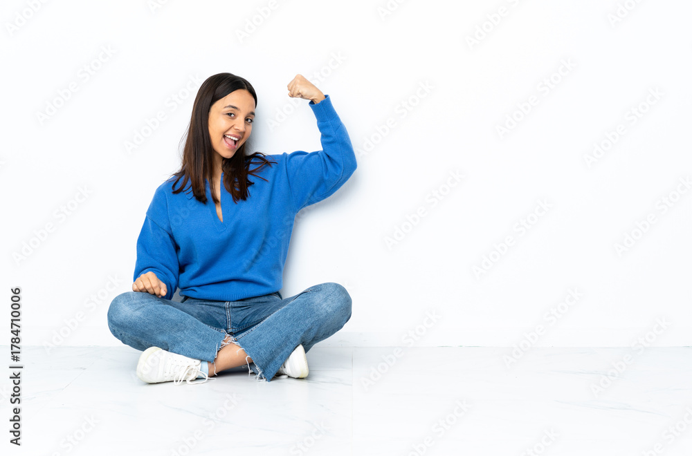Young mixed race woman sitting on the floor isolated on white background doing strong gesture