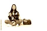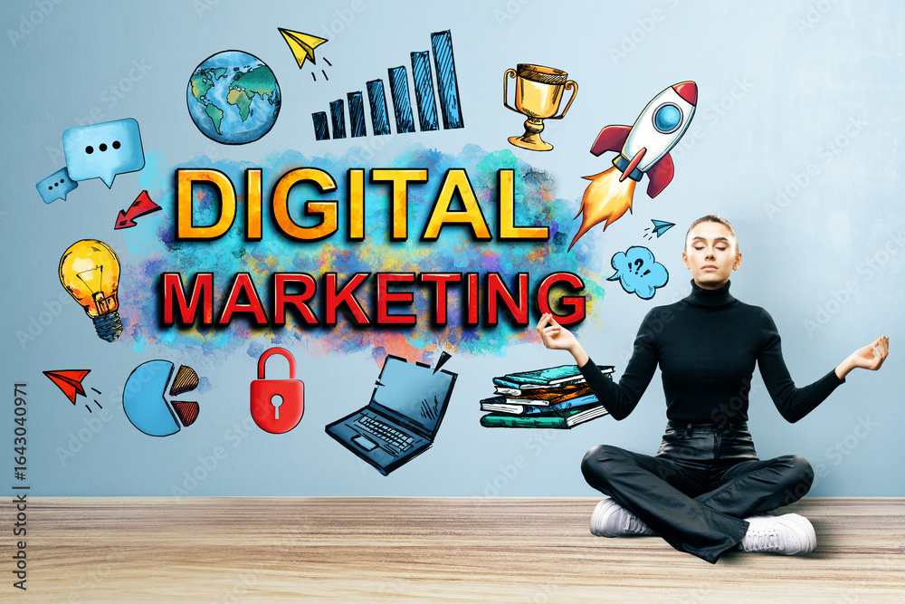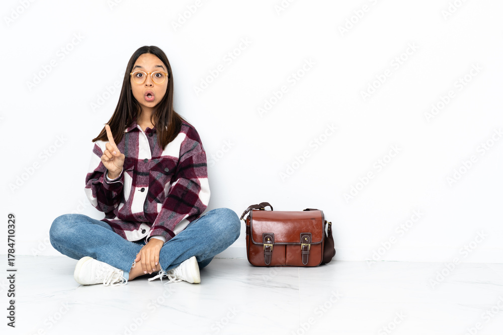 Young student woman sitting on the floor intending to realizes the solution while lifting a finger up