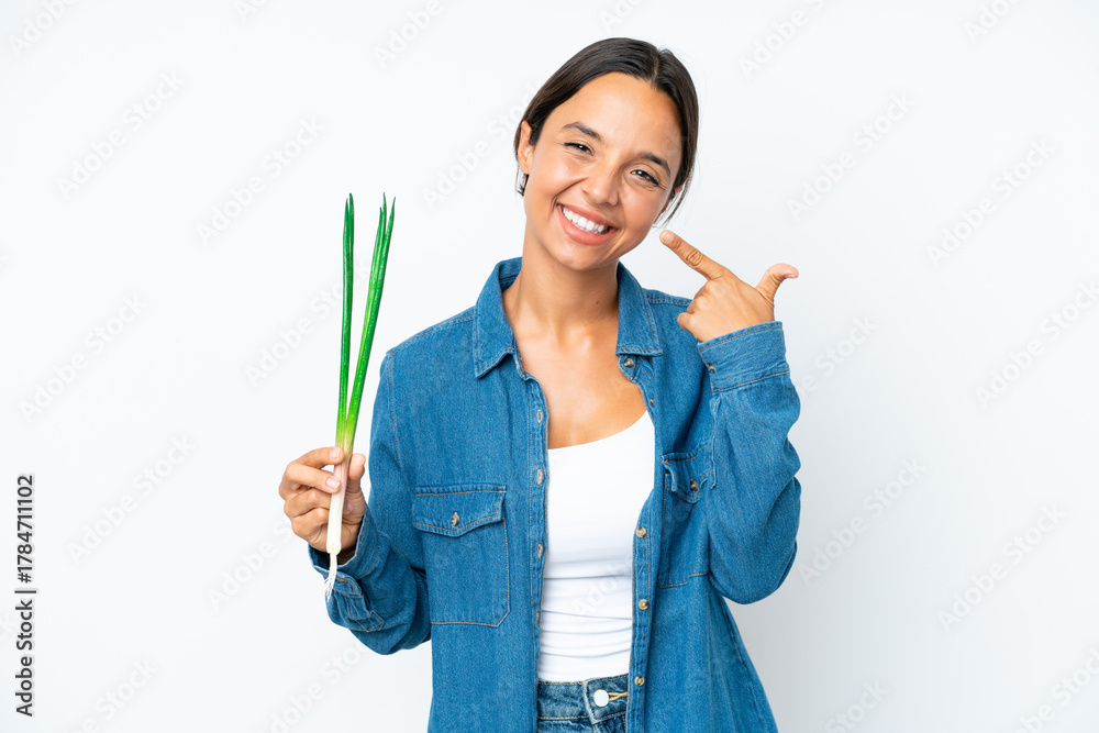 Young hispanic woman holding chive isolated on white background giving a thumbs up gesture