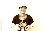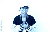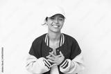 Young hispanic woman wearing a baseball uniform isolated on white background smiling a lot