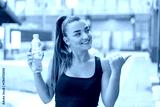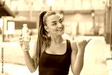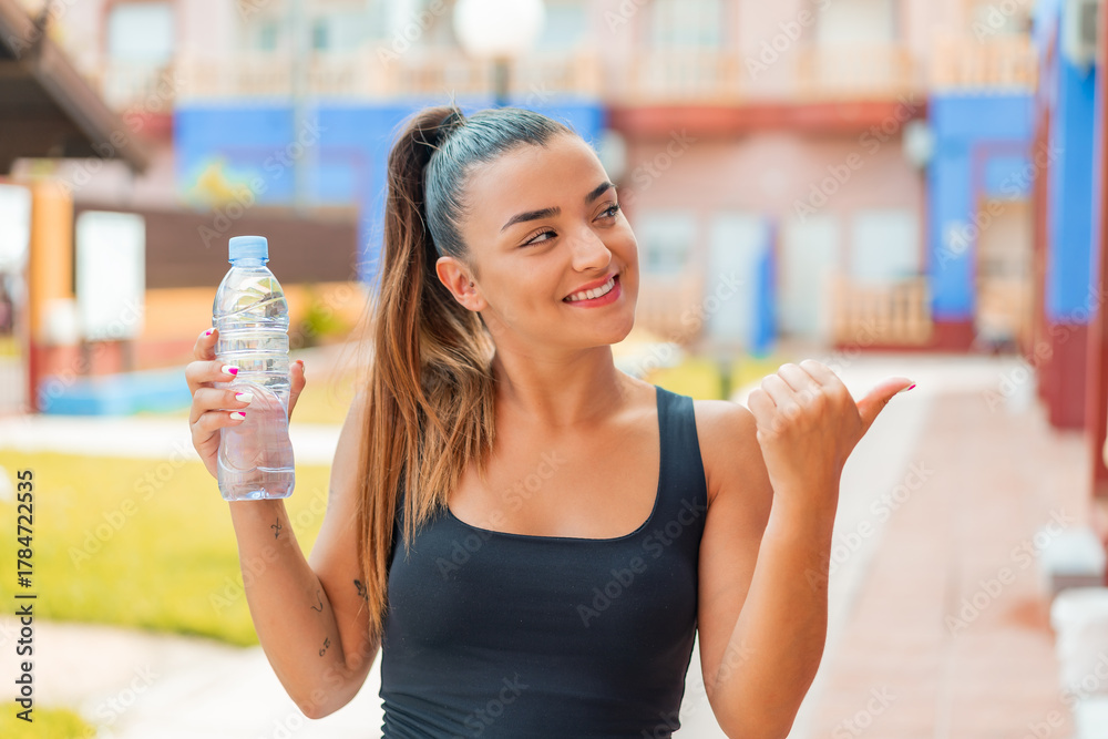 Young pretty woman with a bottle of water at outdoors pointing to the side to present a product
