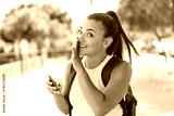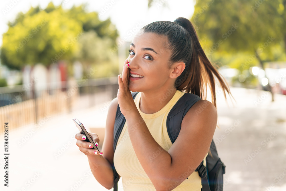 Young pretty woman using mobile phone at outdoors whispering something
