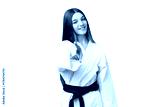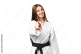 Teenager girl doing karate over isolated chroma key background pointing front with happy expression