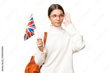 Teenager student caucasian girl holding an United Kingdom flag over isolated background having doubts and thinking
