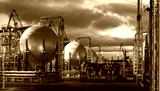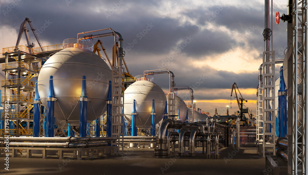 Petrochemical plant operates spherical gas storage tanks and metal pipelines. Industrial facility for processing, storage, and distribution of oil and chemical products.