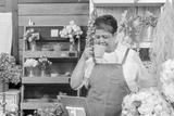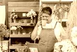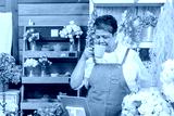 Asian senior florist sipping warm tea with closed eyes enjoying peaceful moment during break in cozy flower shop filled with pastel bouquets and floral decor after morning customer orders