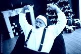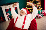Santa cheers in a cozy living room celebrating Christmas with a decorated tree and gifts as he raises his arms in joy and laughter