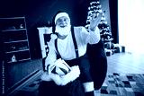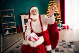 Santa Claus waves hello at a festive home Christmas scene with a glowing tree gifts and cozy decor