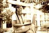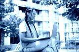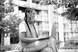 Young woman student outdoors with laptop in modern city park wearing a bright green vest and pink headphones