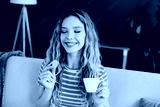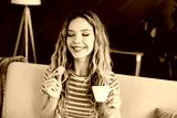 Happy young woman on a yellow couch enjoying a cookie and tea in a bright cozy living room at home