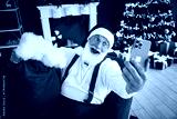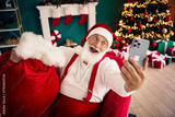 Santa Claus takes a joyful selfie in a cozy Christmas home scene with a big red bag of gifts beside a lit tree and wrapped presents showing festive family humor and holiday magic