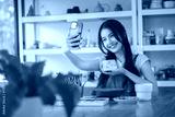 Happy asian female artist taking selfie with handmade pottery design in creative studio – smiling sculptor sharing artwork on social media for online selling, digital portfolio and creative expression