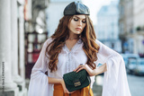 Outdoor waist up portrait of young fashionable woman holding small green bag, posing in street. Model with beautiful long hair. Lady wearing stylish clothes, leather beret. Female fashion concept