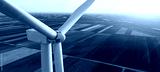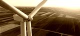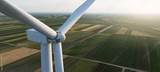 Aerial view of wind turbine on an agricultural filed at sunset. Close up of blades