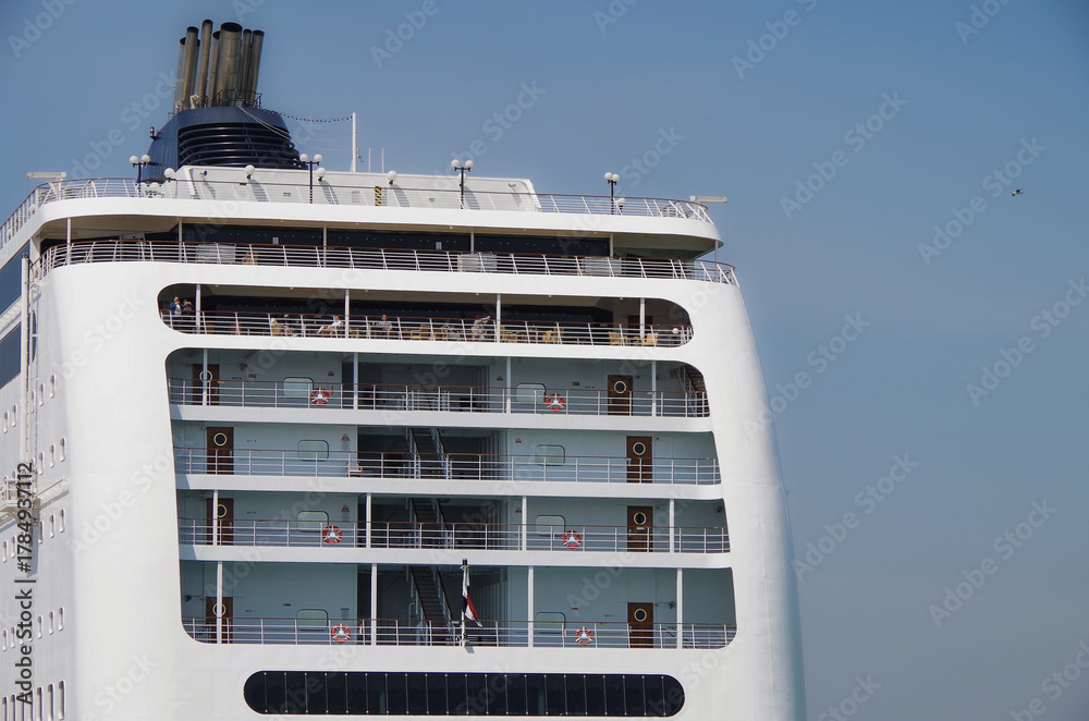 Italian family cruiseship cruise ship liner Lirica, Armonia or Sinfonia in port of Civitavecchia, Rome Italy during Summer Mediterranean cruising with harbor infrastructure marine traffic