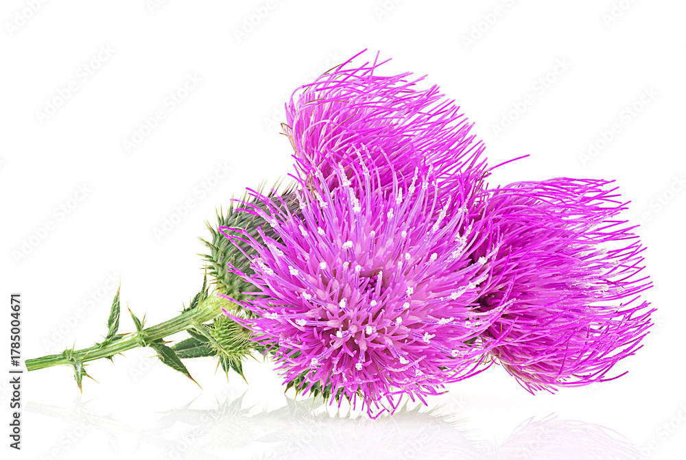 Milk thistle flower heads isolated on a white background. Silybum marianum herb.