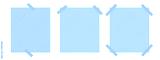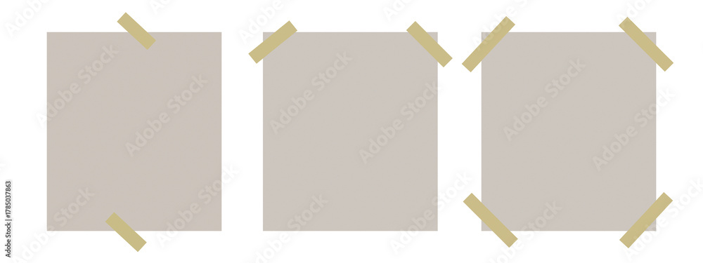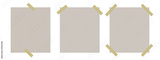 Three blank rectangular paper notes with rounded corners attached with light brown tape to a transparent background isolated on transparent background