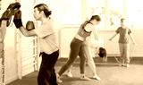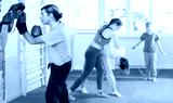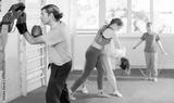 Man works out strength and speed of boxing punch mitts with help of male partner in boxing paws. Man performs role of target and mannequins during training strike technique