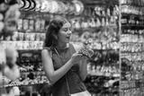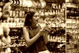 Nice young girl tourist choosing traditional spanish ceramic figurine as gift in big souvenir market