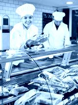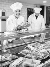Positive young butcher shop saleswoman arranging meat products on display case, showing piece of fresh raw veal tenderloin