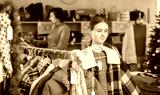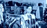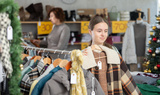 In sales area of store during Christmas sale, teen girl customer choose plaid jacket. Creating capsule wardrobe, branded clothing at affordable prices. Modern urban fashion, casual practical clothes