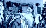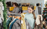 In sales area of store during Christmas sale, teen girl customer choose down jacket. Creating capsule wardrobe, branded clothing at affordable prices. Modern urban fashion, casual practical clothes