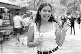 Happy young woman posing cheerfully against background of Rambla Street of Barcelona