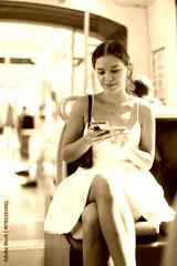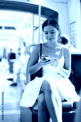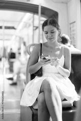 Young woman with a phone in hands is sitting in a modern bus. European woman in a sundress after a walk through the summer city uses public transport