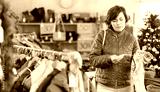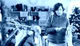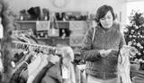 Adult woman buyer choosing jeans in clothing store decorated for christmas
